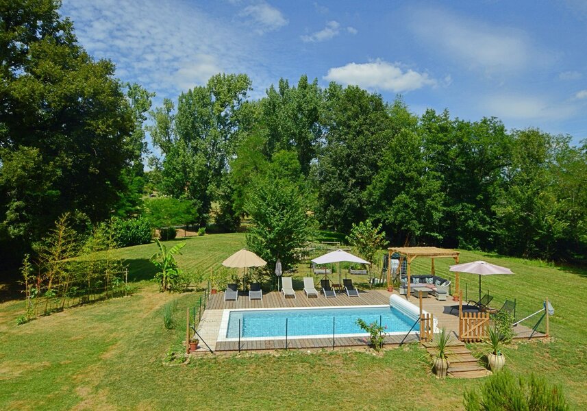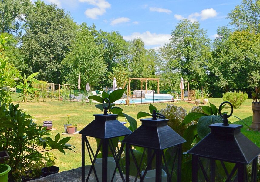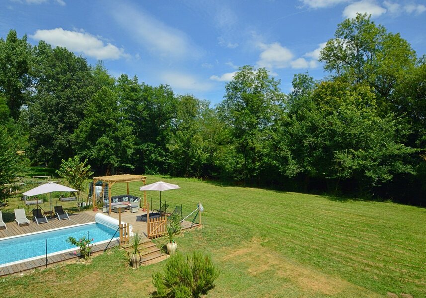 Extérieur Les familles apprécient particulièrement l'espace extérieur du Moulin du Martinet. Accessible par un pont privé, la villa s'ouvre sur un vaste jardin clos, offrant aux enfants un espace de jeu et d'exploration pendant que les parents se détendent.
