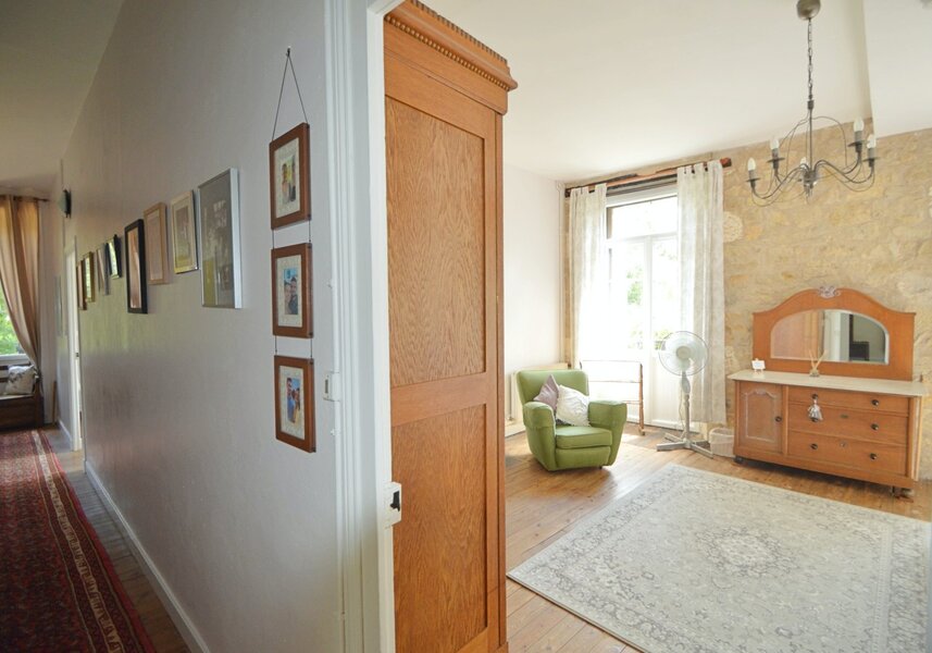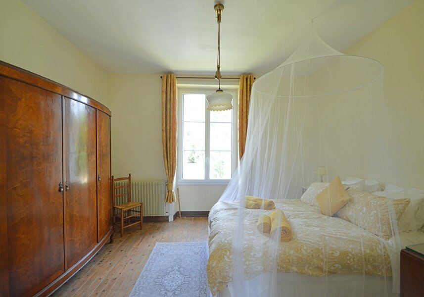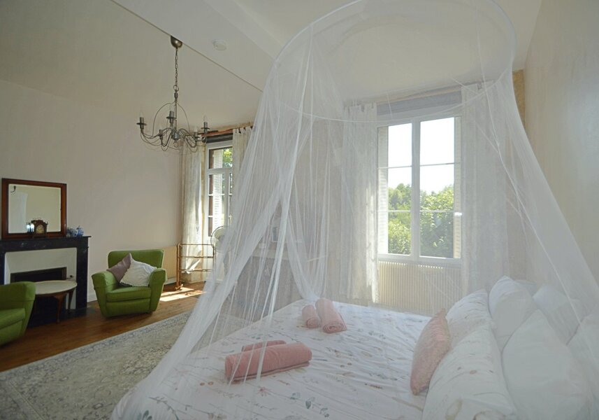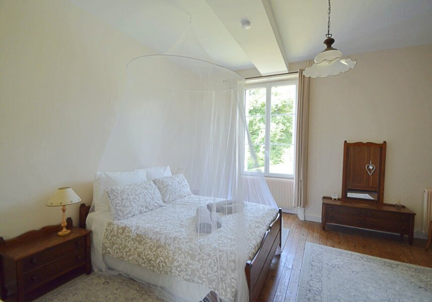 À l'étage, un bel escalier en bois mène à un grand hall d'entrée et à quatre chambres doubles spacieuses, toutes décorées dans un style champêtre français apaisant. Chaque chambre offre une vue sur le jardin et la rivière, créant une atmosphère reposante pour les parents comme pour les enfants. Une deuxième salle de bains moderne avec douche, double vasque et WC complète cet étage.