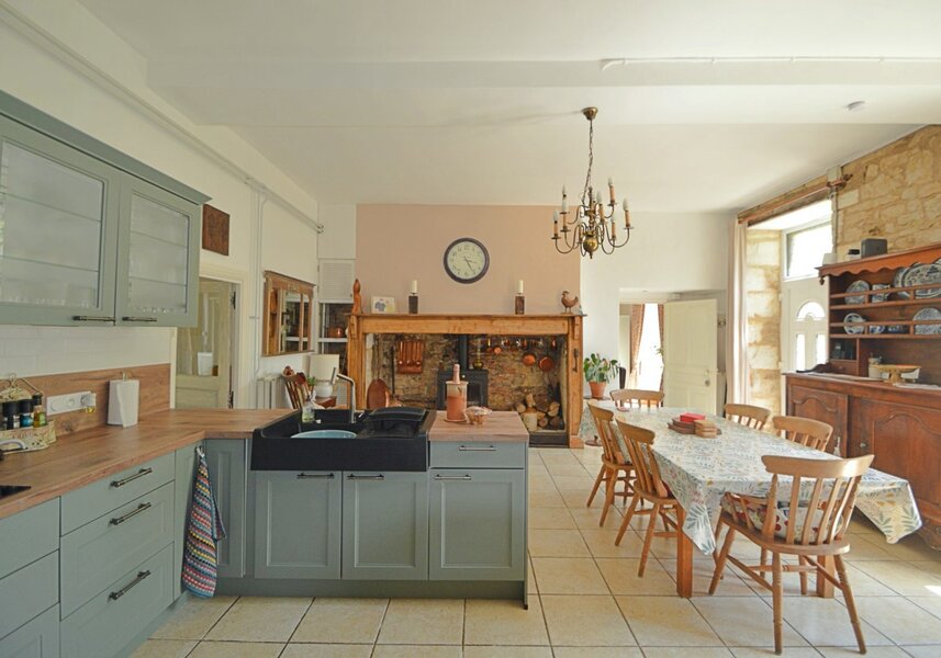 Agencement intérieur Au cœur de la maison se trouve une grande cuisine française contemporaine, conçue pour la vie de famille. Avec sa cuisine luxueuse récemment aménagée, sa table à manger de style campagnard et ses sièges confortables près du poêle à bois, cet espace convivial est idéal pour partager des repas, des jeux et des soirées de détente.
