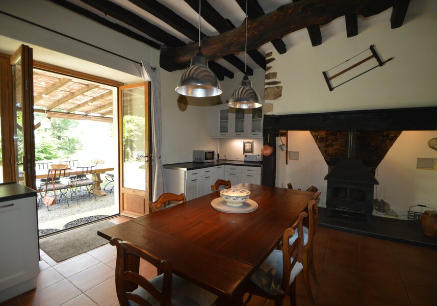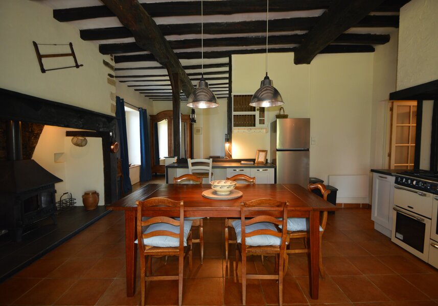 À l'intérieur, cuisine équipée avec poêle à bois, large choix de vaisselle, machine à café Nespresso et filtre, bouilloire, grille-pain, four et micro-ondes, plaque de cuisson au gaz, lave-vaisselle, le tout ouvert sur le salon avec télévision multimédia et wifi gratuit.