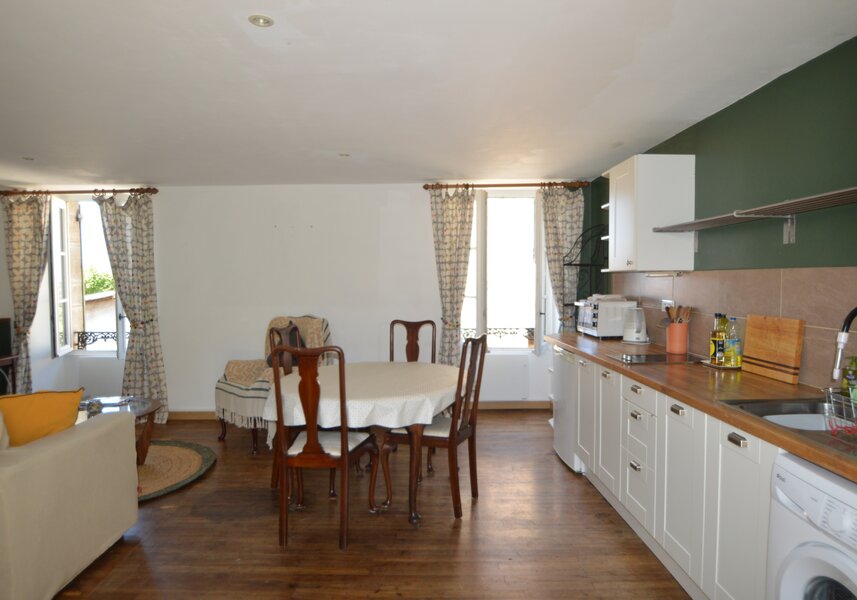 Au premier étage, un coin salon avec canapé en L et télévision est un espace agréable pour profiter de la vue sur le paisible village traditionnel français, avec vue sur la campagne de la Dordogne et ses champs verdoyants. Un lecteur CD et une collection de CD vous permettent d'écouter de la musique, un lecteur DVD pour regarder un film, ou encore de jouer à un jeu ou de choisir un livre parmi la sélection variée proposée ! Cette pièce comprend également la salle à manger et la cuisine, dotées de nombreux sièges. Très fonctionnelle et moderne, elle est équipée d'un plan de travail en chêne, d'une plaque de cuisson, d'un four à poser et d'une machine à café Tassimo.