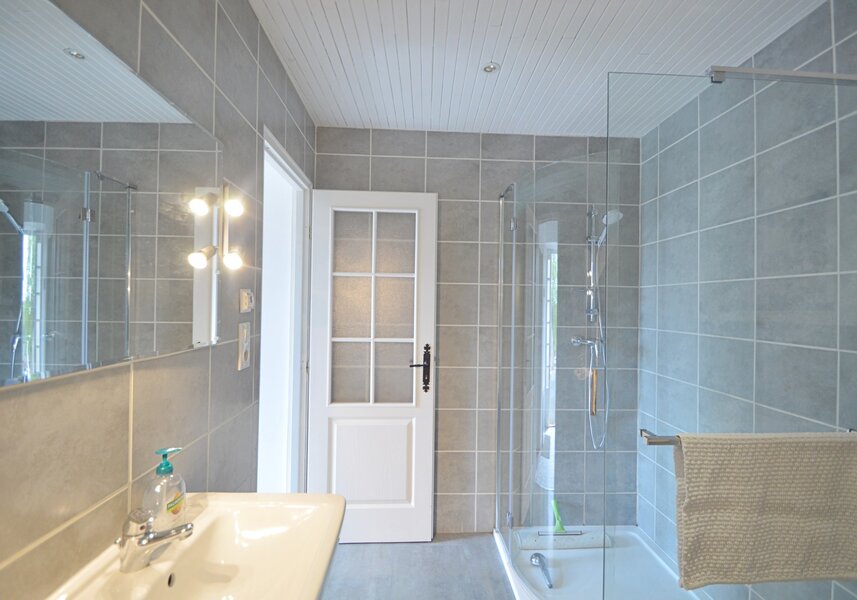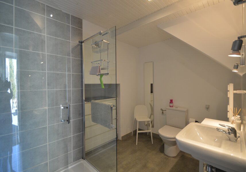 Une grande salle de bains moderne avec douche à l'italienne, chauffage au sol et sèche-serviettes est située au rez-de-chaussée à côté de la chambre.